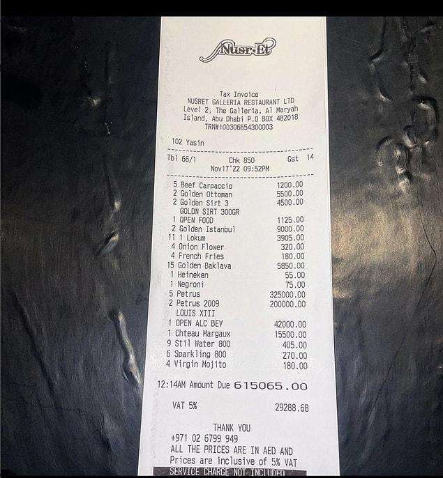 Dünyada ‘Salt Bae’ olarak tanınan Nusret, restoranlarında ödenen astronomik ücretlerle şaşırtmaya devam ediyor. Nusret’in Abu Dhabi’deki restoranına ait hesaba bakarken toplama, çarpma, çıkarma işlemlerini unutacağınız kesin!