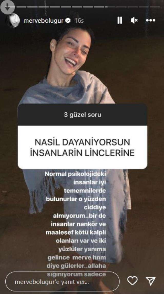 Instagram’da 4 milyon takipçisi bulunan Merve Boluğur, dini içerikli videolar izlediği anı paylaşarak “Güzel videolar” notunu ekledi. Daha sonra tesbih fotoğrafı yayınlayan ünlü isim bir takipçisinin “Zorluklarla nasıl başa çıkıyorsun?” sorusuna “İnanç” cevabını verdi.