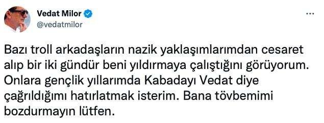 520 bin takipçili Instagram hesabının yanı sıra twitter hesabından da paylaşmayı ihmal etmeyen Vedat Milor “Bana kabadayı Vedat derlerdi” diyerek adeta takipçilerine meydan okudu.
