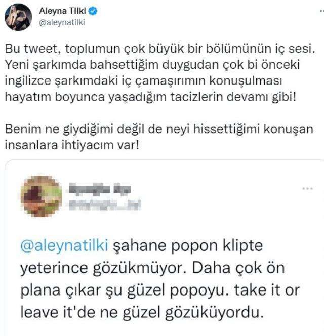 Tilki’nin klibini izleyen bir sosyal medya kullanıcısı, “Şahane popon yeterince gözükmüyor. Daha çok ön plana çıkar. Take It or Leave It’de ne güzel gözüküyordu” yorumunu yaptı. Gelen çirkin yoruma sessiz kalamayan Aleyna Tilki, ise paylaşımı Twitter hesabından yayınlayarak şu sözlerle sitem etti: “Bu tweet, toplumun çok büyük bir bölümünün iç sesi. Yeni şarkımda bahsettiğim duygudan çok bir önceki İngilizce şarkımdaki iç çamaşırımın konuşulması hayatım boyunca yaşadığım tacizlerin devamı gibi! Benim ne giydiğimi değil de neyi hissettiğimi konuşan insanlara ihtiyacım var!”