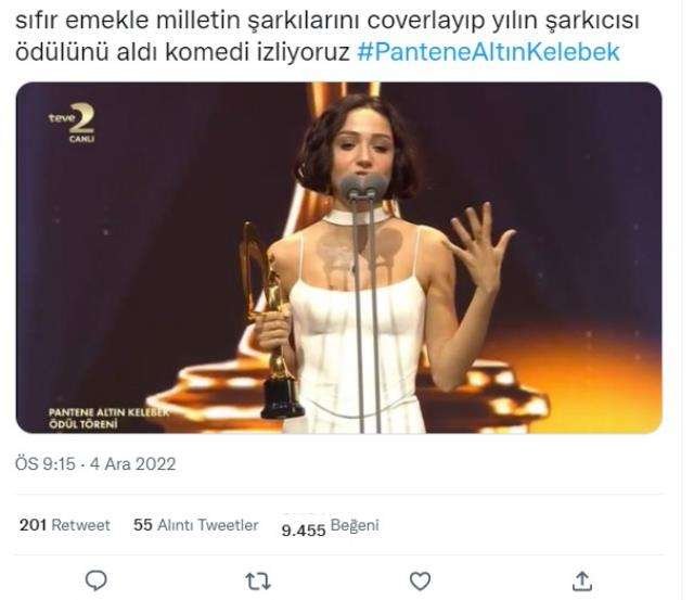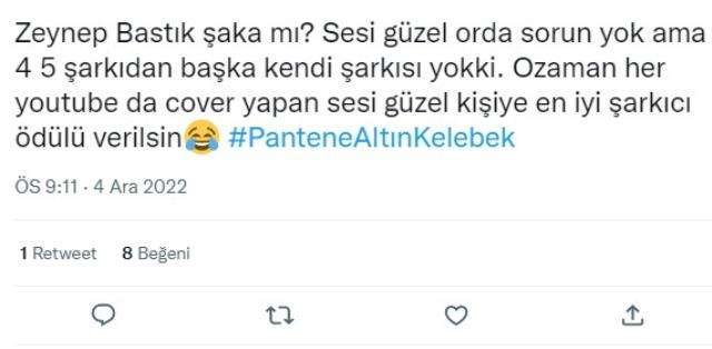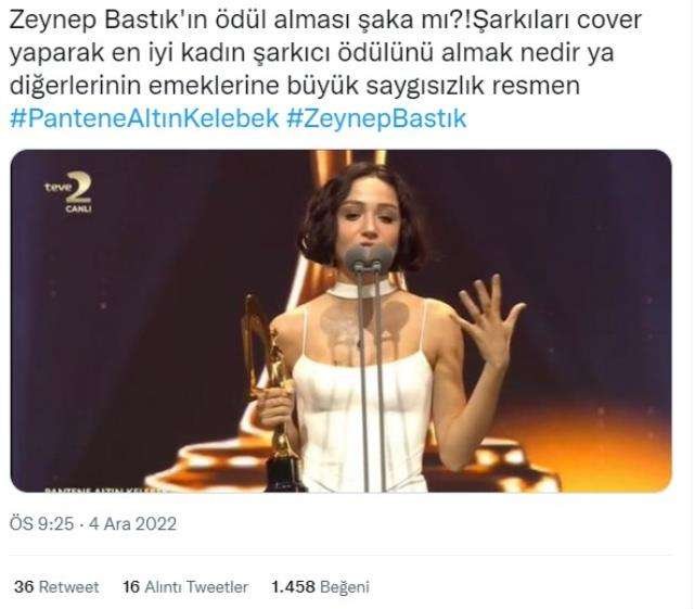 Pantene Altın Kelebek’te En İyi Kadın Şarkıcı ödülünü alan Zeynep Bastık, sosyal medyanın gündemine oturdu. Birçok kullanıcı Zeynep Bastık’ın ödülü hak etmediğini söyledi. Kullanıcılar “Kendine ait 3-5 şarkıcı var, diğer şarkıcıların hakkın yendi” tarzında yorumlar yaptı.