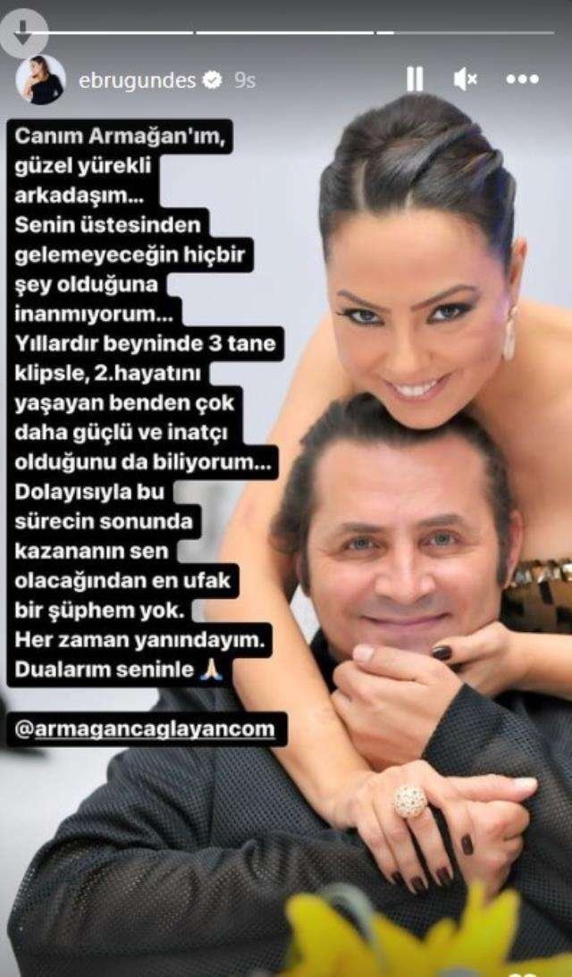 Instagram hesabından Çağlayan’la çektirdiği bir fotoğrafı yayınlayan Ebru Gündeş, “Canım Armağan’ım, güzel yürekli arkadaşım. Senin üstesinden gelemeyeceğin hiçbir şey olduğuna inanmıyorum. Yıllardır beyninde 3 tane klipsle, 2. hayatını yaşayan, benden çok daha güçlü ve inatçı olduğunu da biliyorum. Dolayısıyla bu sürecin sonunda kazananın sen olacağından en ufak bir şüphem yok. Her zaman yanındayım, dualarım seninle” dedi.