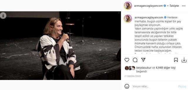 Dün akşam saatlerinde Instagram hesabından sağlık durumuyla ilgili paylaşım yapan Armağan Çağlayan, şu ifadeleri kullandı: “Herkese merhaba, bugün sizinle kişisel bir şey paylaşmak istiyorum. Yakın zamanda yaptırdığım yıllık sağlık taramasında akciğerimde bir kitle tespit edildi ve yapılan tetkikler sonucunda bugün kitlenin yüksek ihtimalle kanserli olduğu ortaya çıktı. Önümüzdeki hafta sonundan itibaren tedavi sürecine başlayacağım.”
