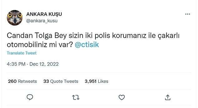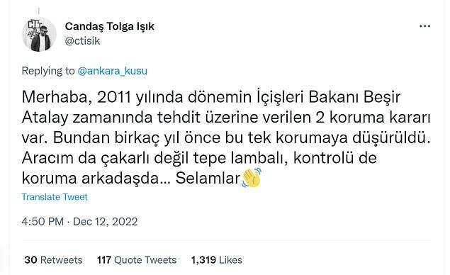 Twitter üzerinden sorulan “Candan Tolga Bey sizin iki polis korumanız ile çakarlı otomobiliniz mi var?” sorusunu sorması üzerine Işık’tan açıklama geldi.