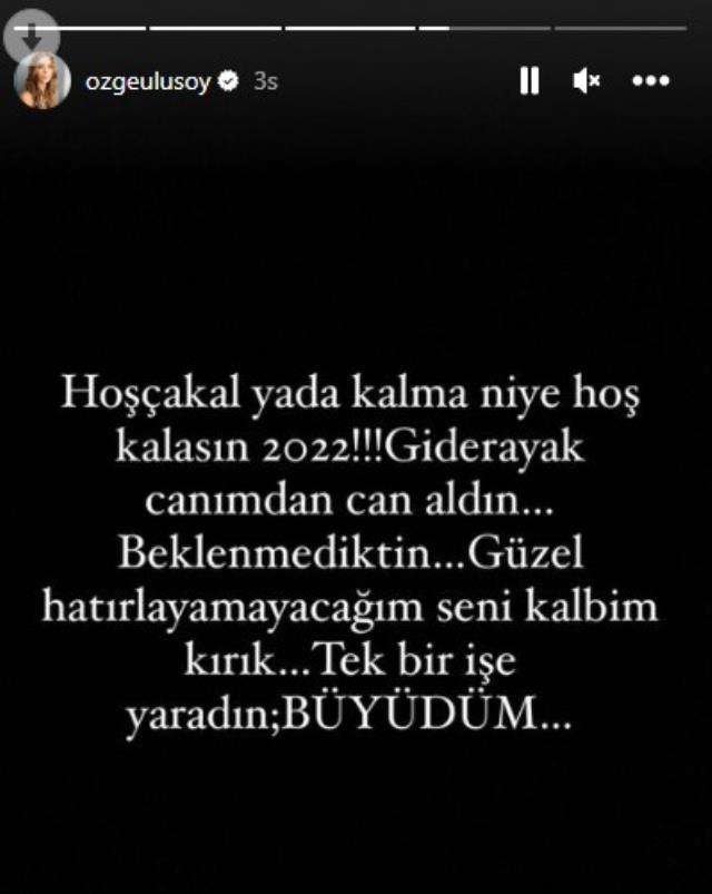 Instagram hesabından yaptığı paylaşımda bu yıl yaşadığı baba acısını hatırlatan Özge Ulusoy, “Hoşça kal ya da kalma niye hoş kalasın 2022! Giderayak canımdan can aldın. Beklenmediktin. Güzel hatırlamayacağım seni, kalbim kırık. Tek bir işe yaradın; büyüdüm” dedi.