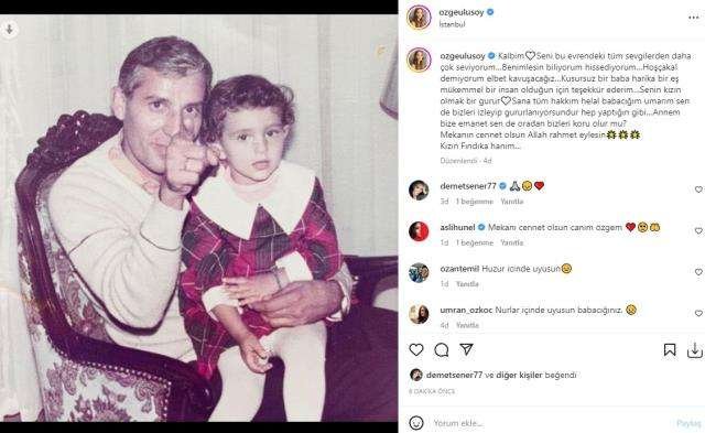 Bir sonrası paylaşımda çocukken babasıyla çektirdiği bir fotoğrafı yayınlayan Ulusoy, şu ifadeleri kullandı: “Kalbim… Seni bu evrendeki tüm sevgilerden daha çok seviyorum. Benimlesin biliyorum hissediyorum. Hoşça kal demiyorum elbet kavuşacağız… Kusursuz bir baba, harika bir eş, mükemmel bir insan olduğun için teşekkür ederim. Senin kızın olmak bir gurur. Sana tüm hakkım helal babacığım umarım sen de bizleri izleyip gururlanıyorsundur hep yaptığın gibi…Annem bize emanet sen de oradan bizleri koru olur mu? Mekanın cennet olsun Allah rahmet eylesin. Kızın Fındıka hanım…”