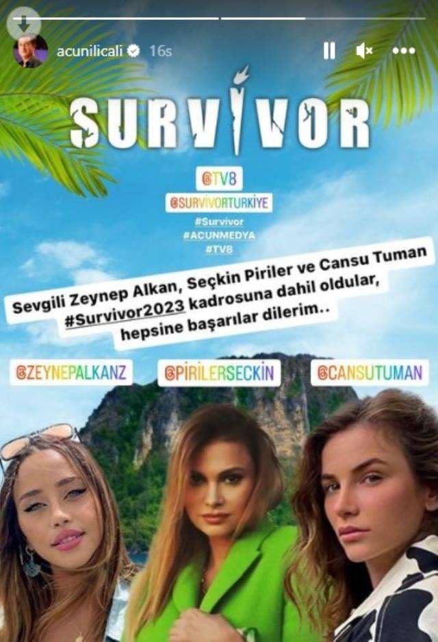 Survivor 2023’ün merakla beklenen ilk kadın yarışmacılar Zeynep Alkan, Seçkin Piriler ve Cansu Tuman oldu. Sosyal medya hesabından yaptığı paylaşımla isimleri duyuran Acun Ilıcalı, yarışmacılara başarılar diledi.