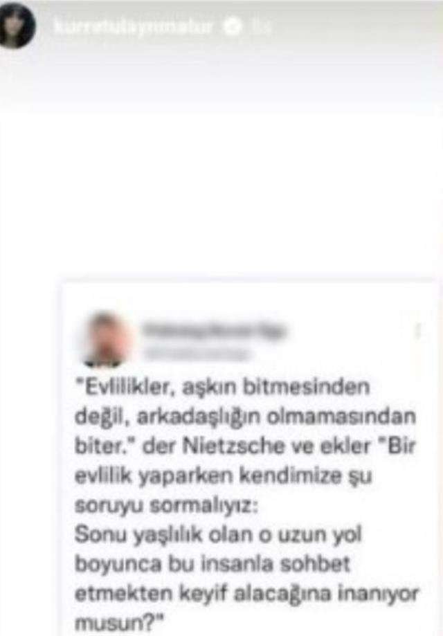 Evliliğini gözlerden uzak yaşamaya çalışan Semih Öztürk ve Kurretülayn Matur’un boşanma kararı aldığı iddia edildi. Ayrılık iddiasının gündem olmasının ardından Matur’un Instagram hesabından yaptığı paylaşım kafa karıştırdı. Boşanma kararı aldığı konuşulan Matur’un Nietzsche’nin “Evlilikler aşkın bitmesinden değil, arkadaşlığın olmamasından biter” sözünü paylaşması boşanma iddiasını güçlendirdi.