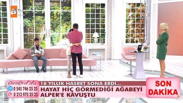 Ailenin yıllar önce evlatlık verdiği oğulları Alper ise yakı çevresinin isteği üzerine izlediği Esra Erol‘da programında kardeşini buldu. Hayat Bayram’ın söylediği isimlerden ve şehirlerden yola çıkarak kardeşi olduğunu öğrenen ağabey Alper, dün canlı yayına katıldı. Kendisi gibi evlatlık verilen ağabeyi Alper’i Esra Erol buldu ve büyük kavuşmada gözyaşları sel oldu.