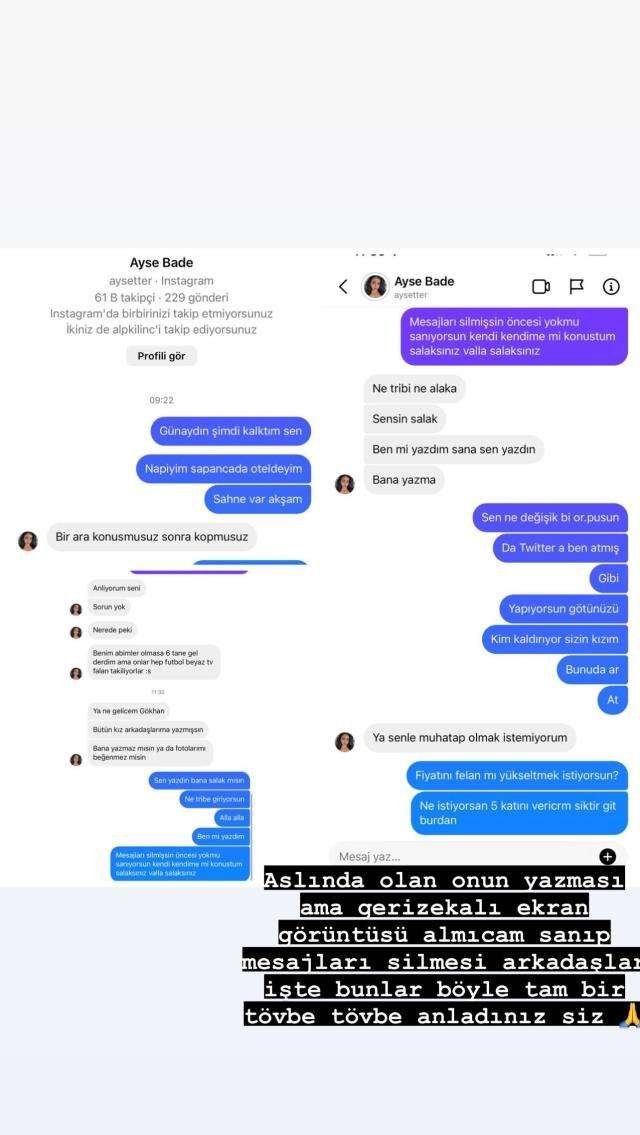 Ayşe Bade’nin paylaşımını gören Gökhan Çıra Instagram hesabından daha önceki yazışmaları paylaşıp fenomen isme ağır konuştu. Gökhan Çıra fenomene attığı mesajda da “Sen ne değişik … da Twitter’a ben atmışım gibi yapıyorsun” diyerek küfür etti.