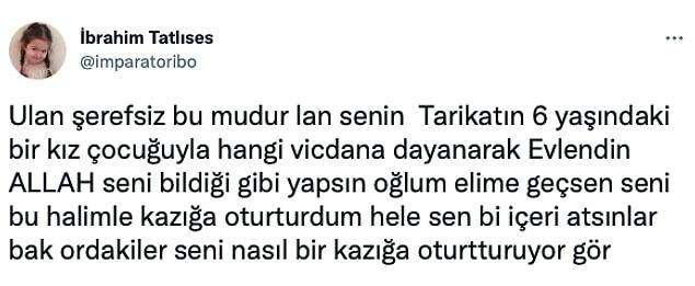 Türkiye’nin gündemine bomba gibi düşen 6 yaşındaki çocuğun imam nikahı ile evlendirilmesi üzerine birçok ünlü isim bu duruma çok sert tepkiler verdi. Bunlardan biri de İbrahim Tatlıses’in ağır sözler içeren tweeti oldu…