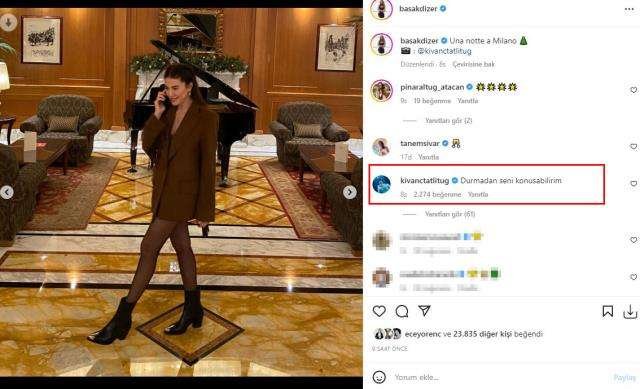 Başak Dizer, sosyal medya hesabından “Milan’da bir gece” notuyla eşi Kıvanç Tatlıtuğ’un çektiği mini etekli fotoğraflarını paylaştı. Eşinin paylaşımına sessiz kalamayan Tatlıtuğ, paylaşıma “Durmadan seni konuşabilirim” yorumunu yaptı.