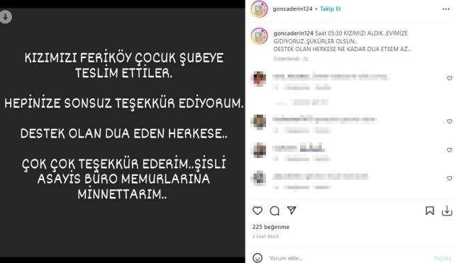 Öte yandan sabaha karşı kızının karakola teslim edildiğini duyuran Gonca Derin, “Kızımızı Feriköy Çocuk Şube’ye teslim ettiler. Hepinize sonsuz teşekkür ediyorum. Destek olan, dua eden herkese çok çok teşekkür ederim. Sabah 05.30’da kızımızı aldık, evimize gidiyoruz. Şükürler olsun” dedi.