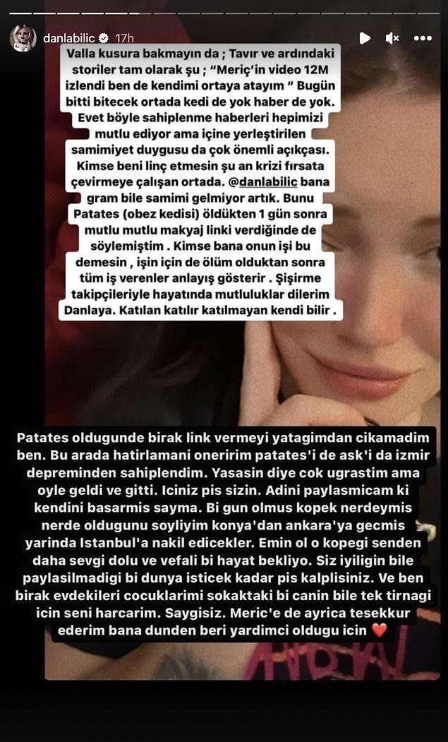 ‘Meriç’in video 12 milyon izlendi, ben de kendimi ortaya atayım diyor, krizi fırsata çeviren ortada. Danla Bilic bana gram bile samimi gelmiyor artık. Bunu Patates öldükten bir gün sonra mutlu mutlu makyaj linki verdiğinde de söylemiştim’ diyen kişinin kim olduğunu bilmiyoruz ancak Danla’nın bu sözler karşısındaki çıkışı sert oldu.