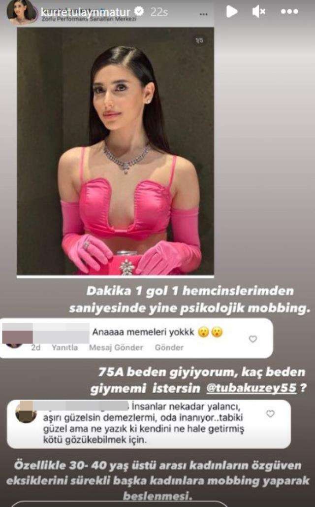 Son olarak Pantene Altın Kelebek Ödül Töreni’nden pozlarını paylaşan Kurretülayn Matur, kendisine gelen bir yorumu çok sinirlendi. Takipçisinin “Ana memeleri yok” mesajını ifşa ederek “Dakika 1, gol 1. Hemcinslerimden saniyesinde yine psikolojik mobbing. 75A beden giyiyorum. Kaç beden giymemi istersin? Özellikle 30-40 yaş arası kadınların özgüven eksiklerini sürekli başka kadınlara baskı yaparak beslenmesi” ifadelerini kullandı.