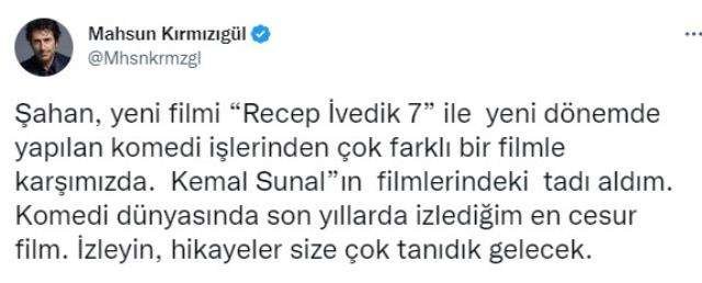 Yayınladığı gün sosyal medya kullanıcılarını ikiye bölen filmle ilgili Twitter’dan paylaşım yapan Mahsun Kırmızıgül, “Şahan, yeni filmi Recep İvedik 7 ile yeni dönemde yapılan komedi işlerinden çok farklı bir filmle karşımızda. Kemal Sunal’ın filmlerindeki tadı aldım. Komedi dünyasında son yıllarda izlediğim en cesur film. İzleyin, hikayeler size çok tanıdık gelecek” ifadelerini kullandı.