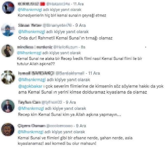 Yönetmen ve şarkıcı Mahsun Kırmızıgül, Şahan Gökhakar’ın son filmi Recep İvedik 7 için “İzlerken Kemal Sunal’ın filmlerindeki tadı aldım” yorumunu yapınca sosyal medyada yer yerinden oynadı. Kırmızıgül’e tepki gösteren birçok kullanıcı “Bu kıyas kabul edilemez” dedi.