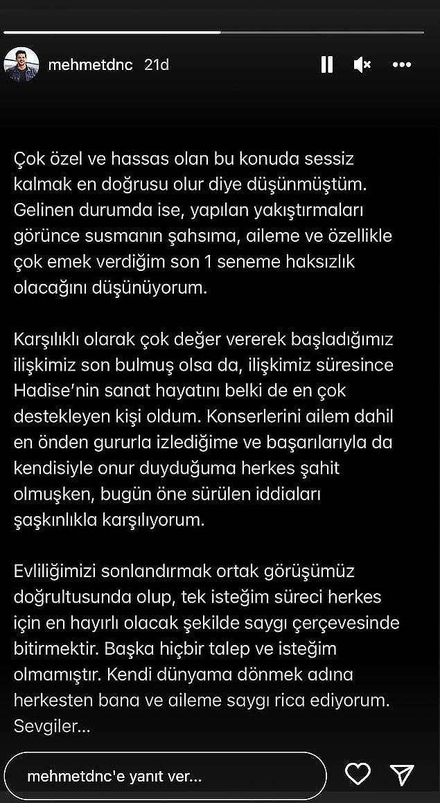 Mehmet Dinçerler’in Hadise’nin kariyerini desteklemediği, çocuk konusunda anlaşamadıkları gibi iddialar ortalıkta dolanırken ikiliden açıklama gelmişti.