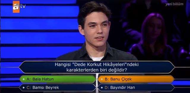 Kim Milyoner İster yarışmasından ender görülen anlardan biri yaşandı. 1 milyon lira değerindeki son soruya gelen genç, “Hangisi Dede Korkut Hikayeleri’ndeki karakterlerden biri değildir?” sorusu karşısında doğru cevaptan emin olamayınca yarışmadan çekilme kararı aldı. Devam etme kararı alsaydı B şıkkını söyleyeceğini belirten genç, doğru cevabın A şıkkı olduğunu görünce “Oh be” diyerek rahat bir nefes aldı.