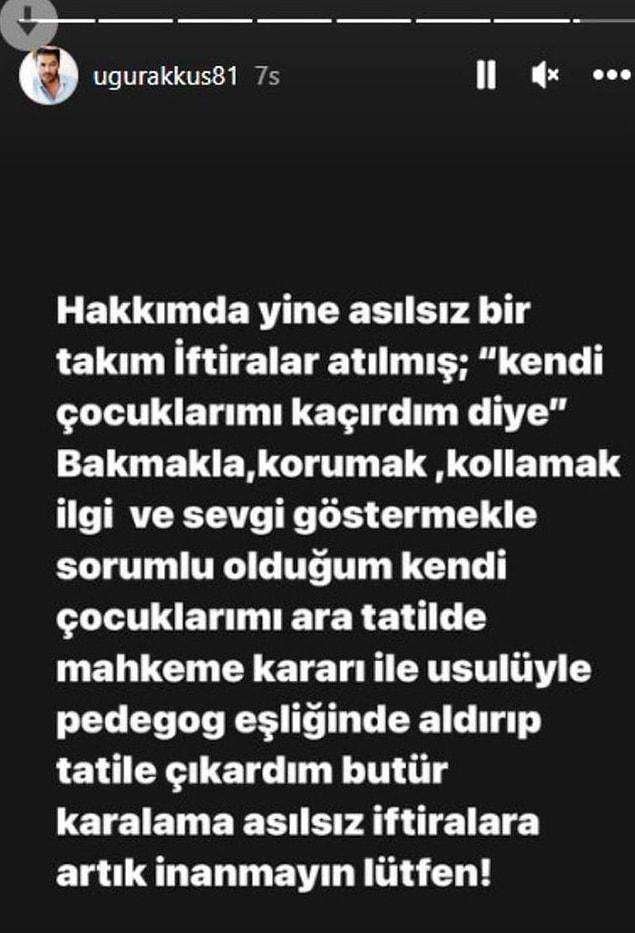 Hakkında çıkan kaçırılma iddialarını reddeden Akkuş paylaşımında, ‘Hakkımda yine asılsız bir takım İftiralar atılmış; kendi çocuklarımı kaçırdım diye. Bakmakla korumak, kollamak ilgi ve sevgi göstermekle sorumlu olduğum kendi çocuklarım, ara tatilde mahkeme kararı ile usulüyle pedogog eşliğinde aldırıp tatile çıkardım bu tür karalama asılsız iftiralara artık inanmayın lütfen!’ dedi.