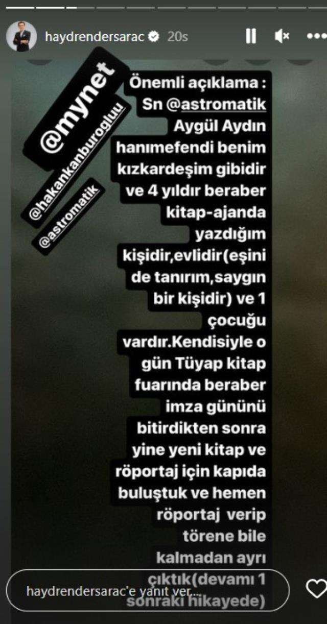 Aygül Aydın ile hakkında çıkan yasak aşk iddiasını kesin bir dille yalanlayan Ender Saraç, Instagram hesabından yaptığı açıklamada şu ifadeleri kullandı: “Aygül Aydın hanımefendi benim kız kardeşimdir gibidir ve 4 yıldır beraber kitap-ajanda yazdığım kişidir. Evlidir, (eşini de tanırım, saygın bir kişidir) ve 1 çocuğu vardır. Kendisiyle o gün Tüyap Kitap Fuarı’nda beraber imza gününü bitirdikten sonra yine yeni kitap ve röportaj için kapıda buluştuk ve hemen röportaj verip törene bile kalmadan ayrı çıktı.”