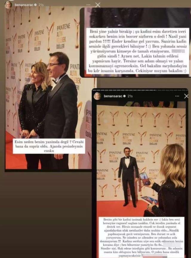 Sosyal medya hesabından eşi Ender Saraç ve Aygül Aydın’ın ödül törenindeki fotoğraflarını paylaşan Benan Saraç, şu ifadeleri kullandı: “Beni yine yalnız bırakıp, şu kadını davetten içeri sokarken, benim için ‘Boşver Şizofren’ dedi. Nasıl yani? Pardon! Ender kendine gel yavrum! Sanırım kadın seninle ilgili gerçekleri bilmiyor. Ben yolumda sessiz yürümüyorum. Kimseye de tamah etmiyorum. S… gidin şimdi! Tahmin edileni yapmıyorum.”