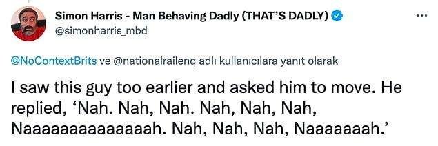 “Bu adamı ben de geçen gördüm ve yer değiştirmesini söyledim. Bana ‘Nah. Nah, Nah. Nah, Nah, Nah, Naaaaaaaaaaaaaah. Nah, Nah, Nah, Naaaaaaah.’ diye yanıt verdi…”
