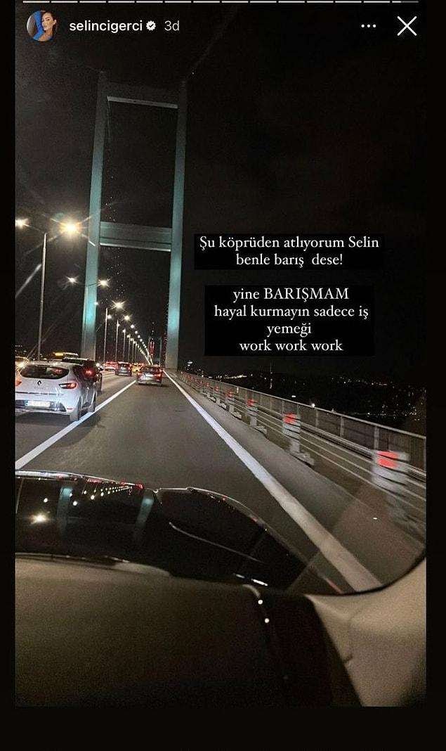 Şöyle bir şey var ki, Selin ve Gökhan birbirlerine laf sokmaya devam ediyor. Mesela son olarak Selin Ciğerci köprüden geçerken Gökhan Çıra ile yeniden barışmayacağını şu paylaşımla duyurdu.