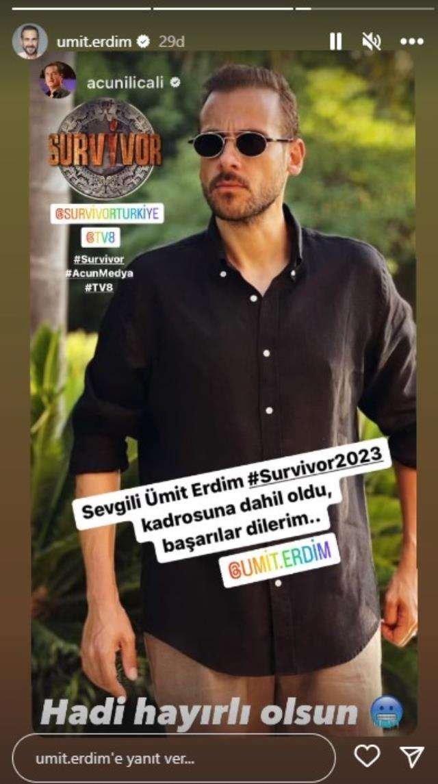 Instagram hesabından Survivor 2023’ün ikinci yarışmacısını duyuran Acun Ilıcalı, “Sevgili Ümit Erdim Survivor 2023 kadrosuna dahil oldu. Başarılar dilerim” ifadelerini kullandı. Ilıcalı’nın paylaşımını kendi hesabından yayınlayan Ümit Erdim ise “Hadi hayırlı olsun” notunu yazdı.