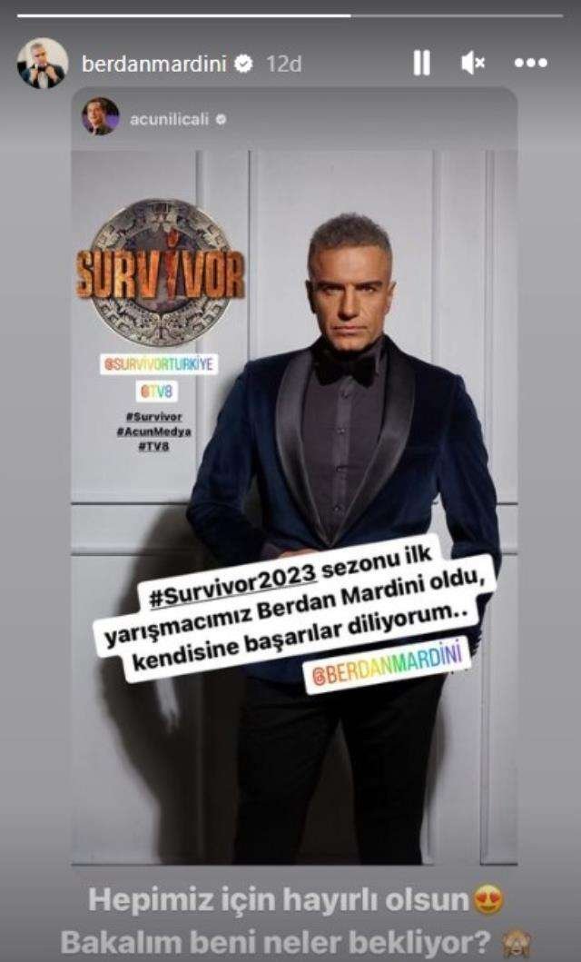 Instagram hesabından Survivor 2023’ün ilk yarışmacısı duyuran Acun Ilıcalı, “Survivor 2023 sezonu ilk yarışmacımız Berdan Mardini oldu. Kendisine başarılar diliyorum” ifadelerini kullandı. Ilıcalı’nın paylaşımını kendi hesabından yayınlayan Berdan Mardini ise “Hepimiz için hayırlı olsun. Bakalım beni neler bekliyor” dedi.