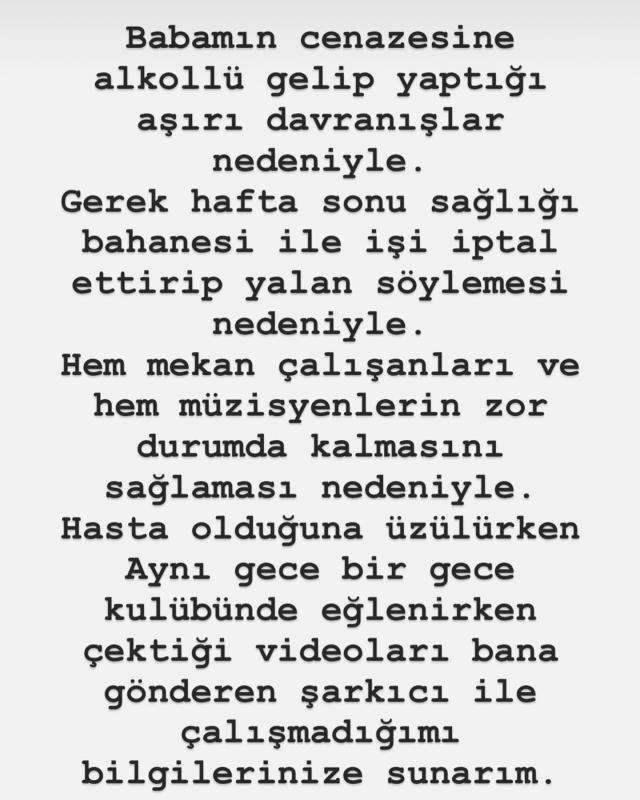 Arsevi Yeter paylaşımında, “Babamın cenazesine alkollü gelip yaptığı aşırı davranışlar nedeniyle. Gerek hafta sonu sağlığı bahanesi ile işi iptal ettirip yalan söylemesi nedeniyle. Hem mekan çalışanları ve hem müzisyenlerin zor durumda kalmasını sağlaması nedeniyle. Hasta olduğuna üzülürken Aynı gece bir gece kulübünde eğlenirken çektiği videoları bana gönderen şarkıcı ile çalışmadığımı bilgilerinize sunarım” açıklamasında bulundu.