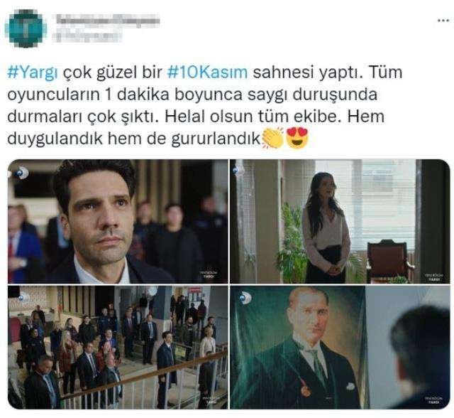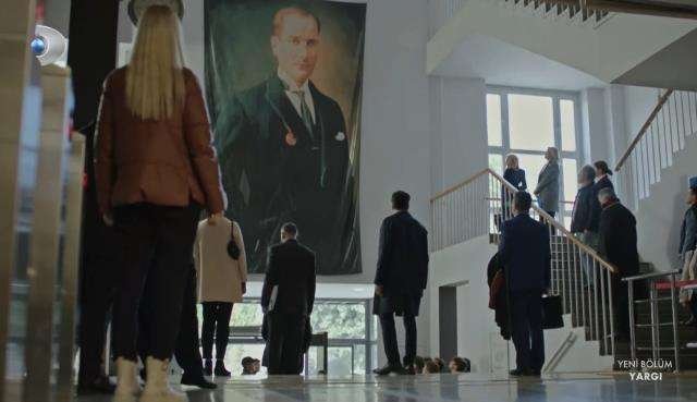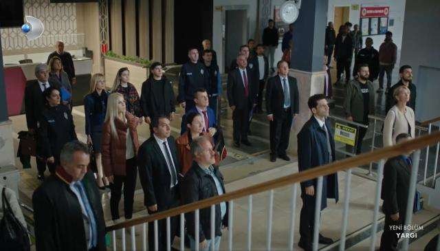 Türkiye Cumhuriyeti’nin kurucusu Mustafa Kemal Atatürk’ün ölüm yıl dönümü 10 Kasım, Yargı dizisi tarafından unutulmadı. Adliyede geçen sahnede siren seslerinin duyulması herkes Atatürk’ün fotoğrafına bakarak bir dakikalık saygı duruşuna geçti.